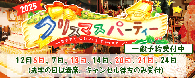 予約可能日: 12月7日(日)、14日(日)、24日(水) モクモクの12月といえばクリスマスパーティ!ゆったりとした空間でお食事と余興を楽しんでいただけるクリスマスイベントです。ぜひ仮装してお越しください!みんなで12月の夜を楽しみましょう!サンタさんも遊びに来てくれるかな? ●対 象: どなたでも応募可能です。 ●時 間: 17:30受付開始 18:00開場〜20:00まで ●場 所: モクモク手づくりファーム内 PaPaビアレストラン ●参加費: 大人(中学生以上)6,500円(税込) 小人(小学生)2,800円(税込) 幼児(3歳以上) 1,500円(税込) 3歳未満 無料 ※レストランで開催のイベント料金となりますので、会員さん特典の「ファームレストランおたのしみカード」は適用されません。
