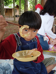 お昼ごはんは、玉ねぎたっぷりカレーとオニオンスライスサラダ、そしてオニオンリングと玉ねぎづくしです☆ 「生の玉ねぎはちょっとからいけど、オニオンリングは甘くておいしいよ!」調理の仕方によっても味が変わることも発見したようです。
