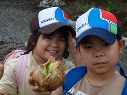 午後は、玉ねぎ収穫の続きと、農学舎のたんぼの田植えのお手伝いもさせてもらいました。土に初めて触れる子もいたけれど、みんなどろどろになりながら汗をかいて農作業に夢中でした。終わった後は、「大変だったけど、楽しかった〜〜!」とすっきりした表情。